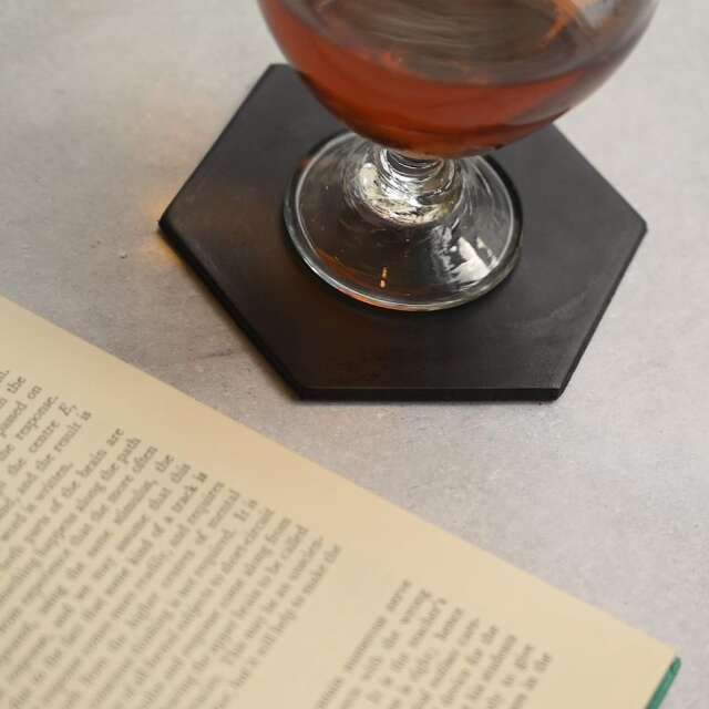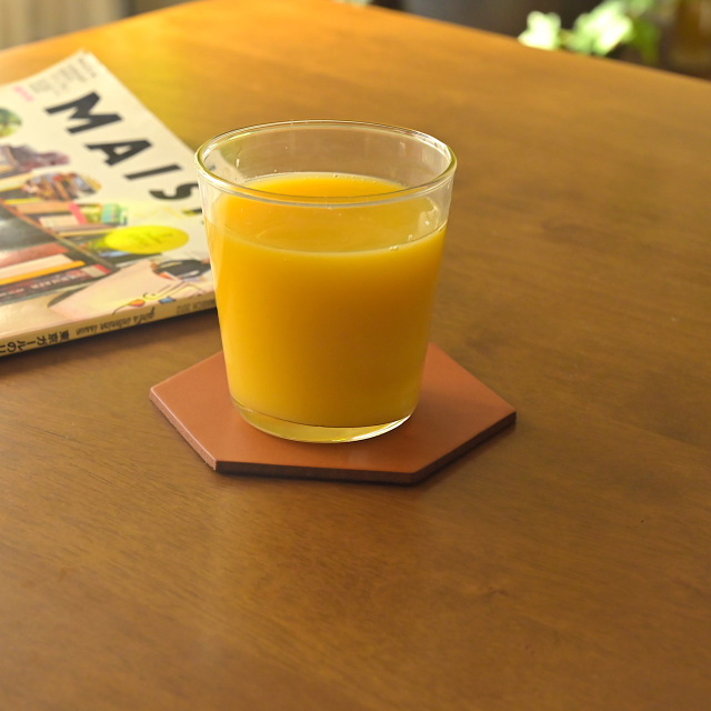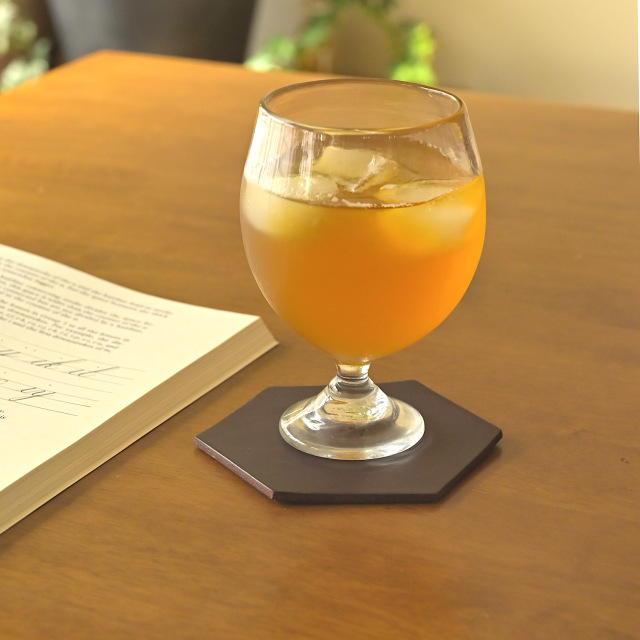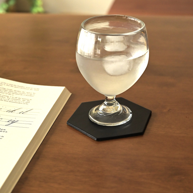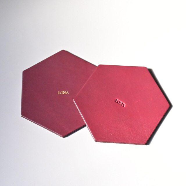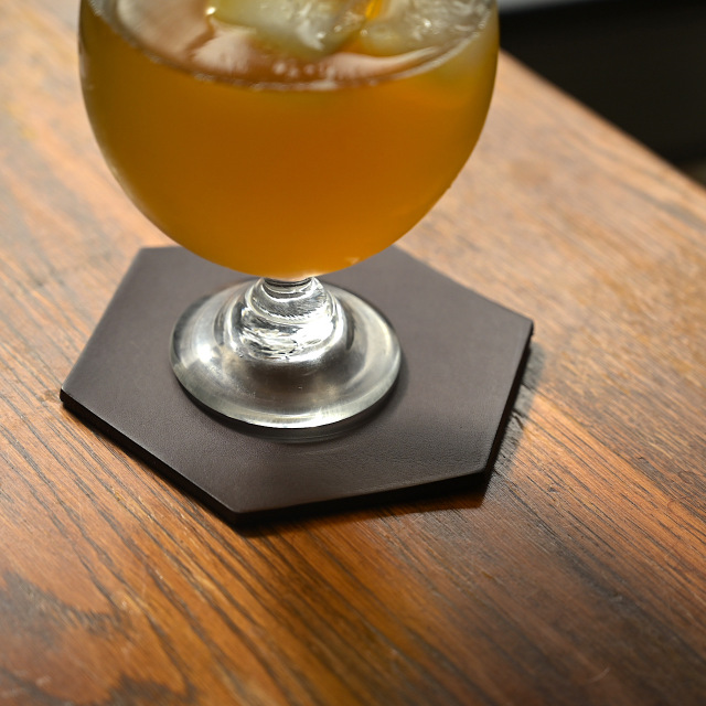 テーブルの上がちょっと華やかになる、ヘキサゴン(六角形)のコースター。丸いマグカップを置いた時の相性は抜群です。革なので、水染も残ってしまうのですが、それも含めて、時間を重ねる程に増していく風合いもお楽しみいただければ幸いです。