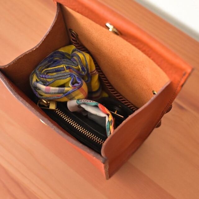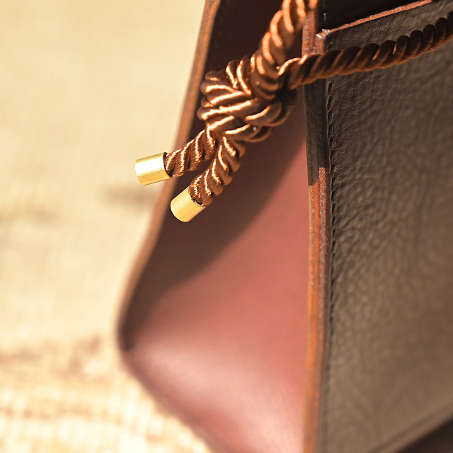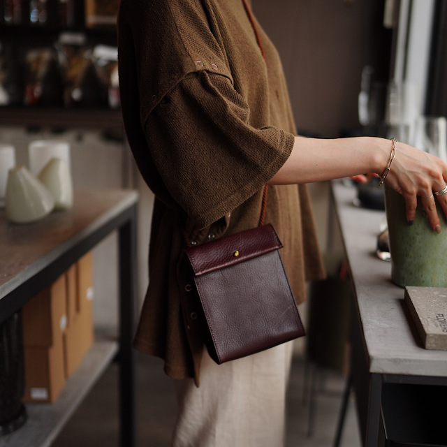 コーヒー豆の袋をイメージしたフォルムで、中には豆が入ってるんじゃ、、、と思わせながら、ちゃんとお財布や鍵、スマホを収納しちゃって下さい。アクセントの真鍮豆金具は小ぶりながらも存在感があります。