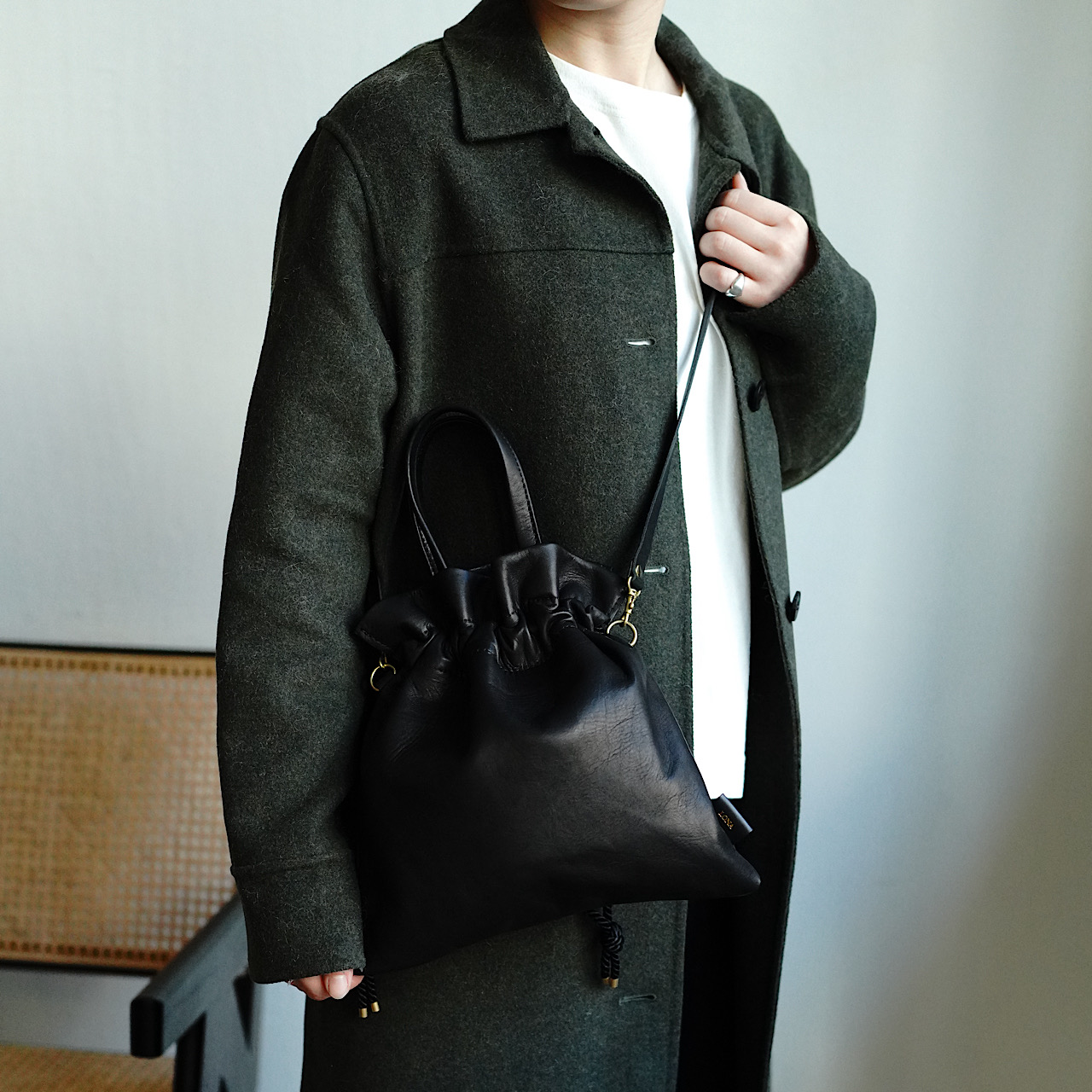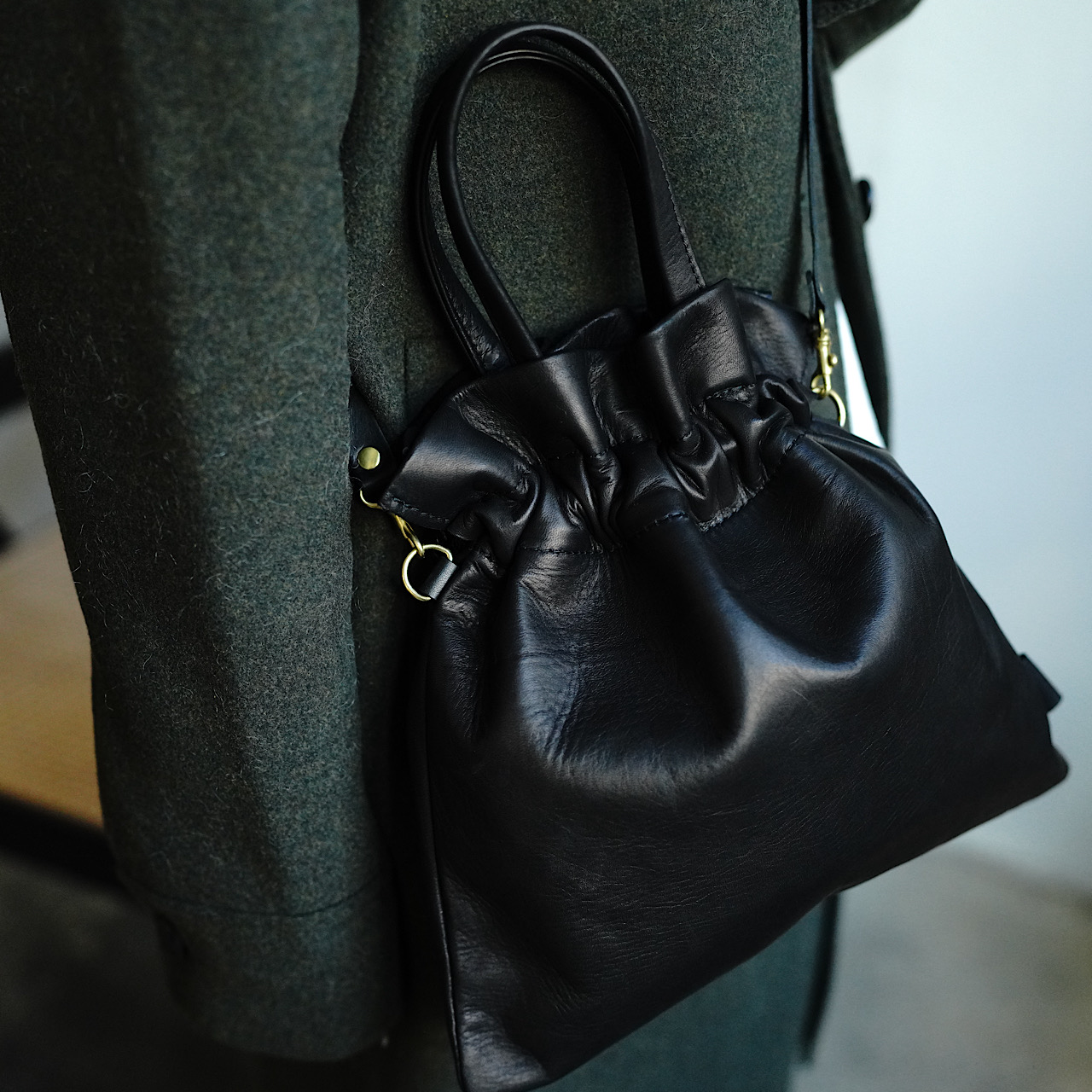柔らかい取手と、デフォルトで着脱可能なストラップ(1,5cm幅)が付いている為、手持ちとショルダーと両方お使いいただけます。